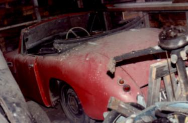 In storage for some decades, seen here with only swallow droppings and a spare back axle to keep it company, the car was restored in time (MoT two days before the off) for the 2003 Jupitour to the Loire Valley, during which it performed faultlessly.