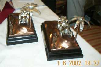 The silver Wait & See trophies on show at Norwich Jowett Car Club rally,