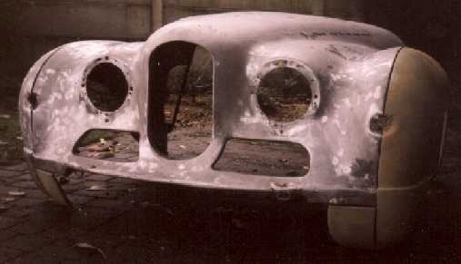 The Nankivell's Jupiter NNK 560 regains original shape in Julian Parker's panel shop. Unexplained bulge over the driver's side headlamp is smoothed out, after hours of skilled attention. The wing awaits more panel beating.